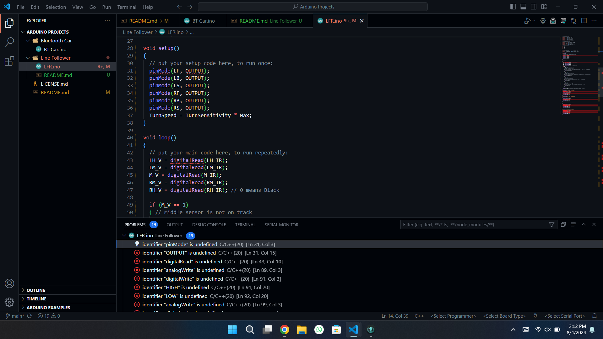 - When using C++ as the language mode for using .ino files, it doesn’t recognize any of the arduino specific functions and treats them as an error.